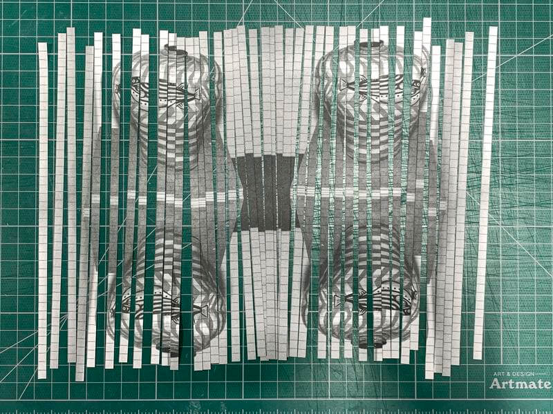 The identical image is flipped and affixed in various directions. After the cutting process, the fragments are skilfully recombined. As a result, I could generate a similar yet subtly distorted image, mirroring the intricate twists in the recollection process and the gradual march of time.